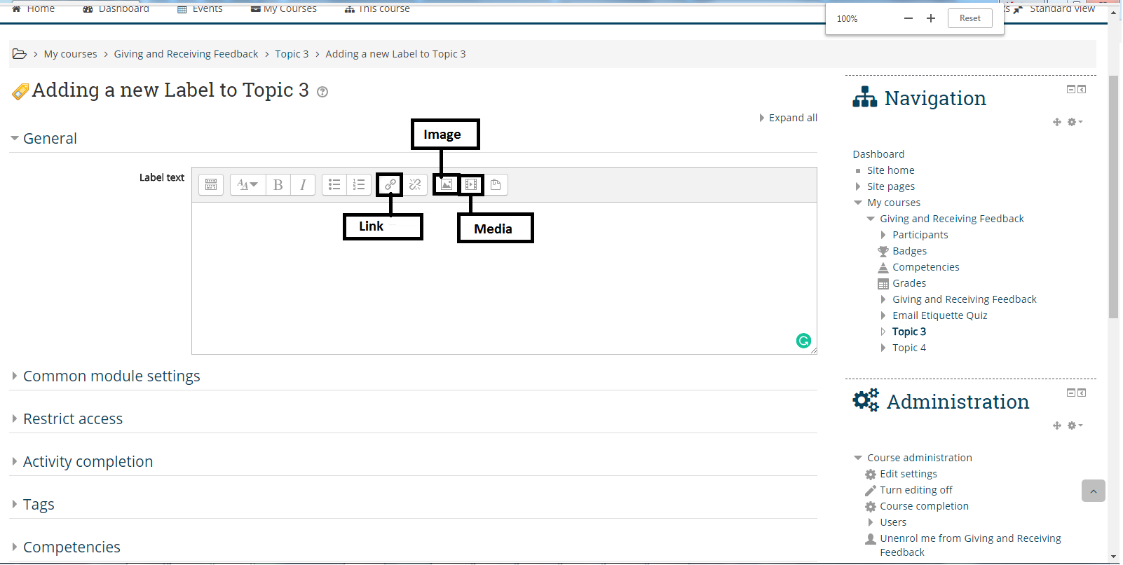 Label in Moodle can be defined as the spacer which is used to add multimedia elements like text, images, video codes and display code from Web 2.0 widgets on the Moodle homepage. It is normally used to give a quick instruction for telling learner what to click next.