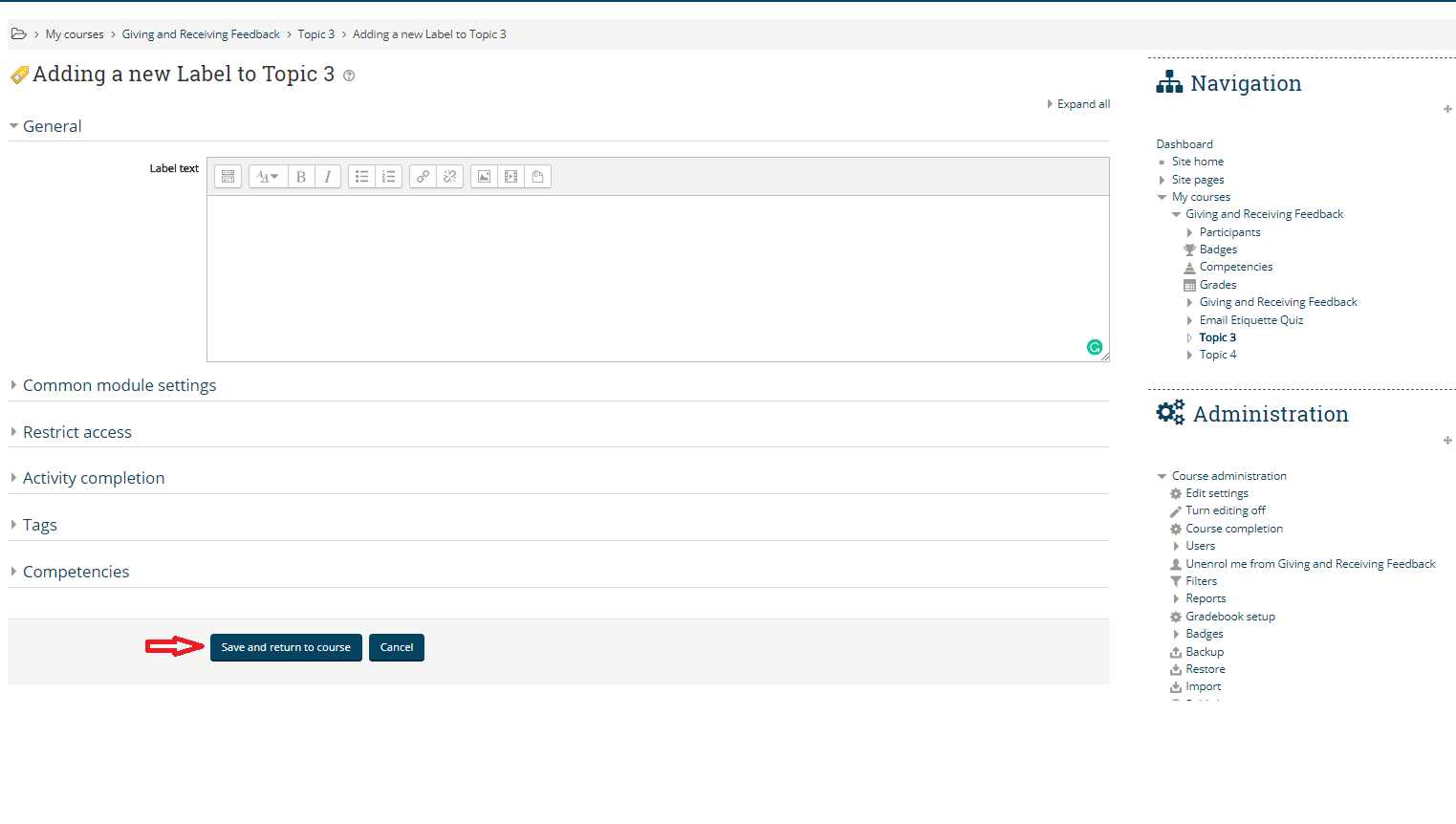 After including the label element, click on “Save and Return to the course” in order to save changes to the label.